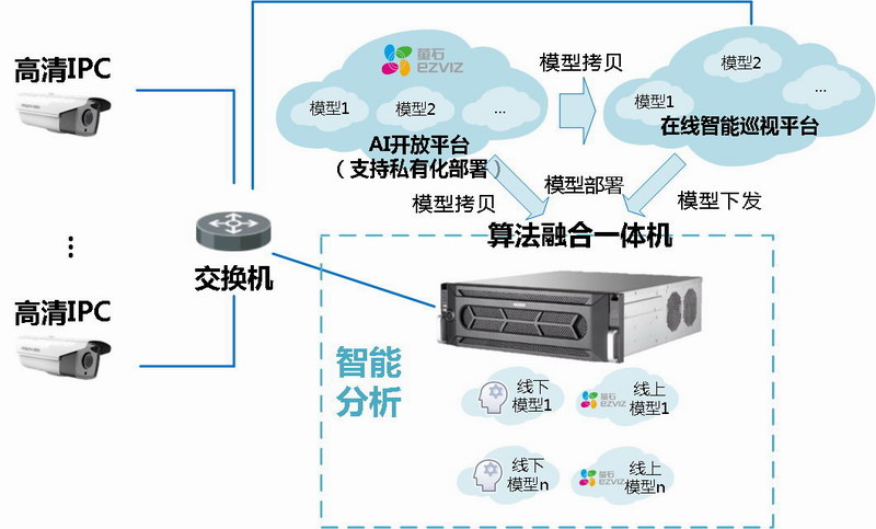 算法融合一体机是本系统的核心组成设备。除了出厂预装的成熟算法,还支持通过萤石AI开放平台训练。对于不成熟的算法,前期需要采集素材,经训练后初步上线,在使用过程中通过不断采集素材进行训练,完成算法的迭代。