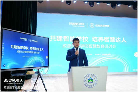 “希沃(seewo)是视睿科技在教育领域的自主品牌,隶属于以显控技术为核心的智能交互解决方案服务商视源股份(股票代码002841),总部位于广州科学城。作为教育信息化应用工具提供商,希沃始终坚持以‘用户为核心’,为支持天立教育未来教育发展,大力推动未来教育产品应用与教学深度融合,充分发挥优秀教师的教学才能,实现教育信息化产品的普及和高效应用。共同开展‘学校+企业’合作模式,深化教育信息产品的实际应用,融合教学创新。”希沃四川区域总经理郎骁在会上介绍到。