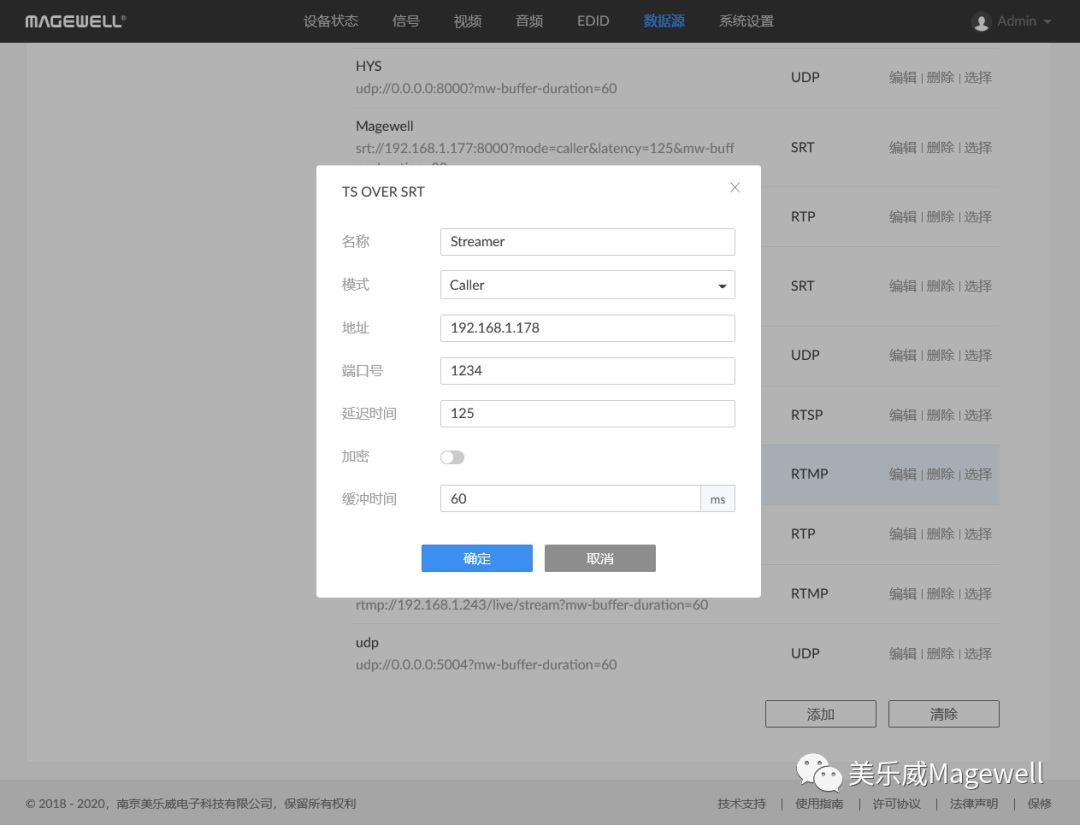 7. 设置完成后点击确定,页面会增加一个SRT Caller流的条目。