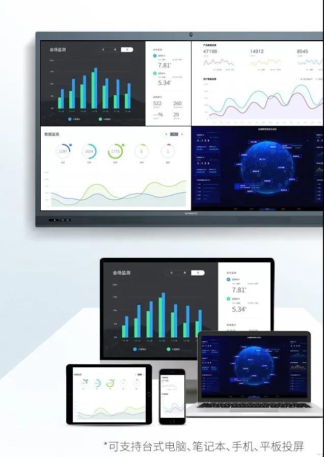 支持电脑、平板、手机多端连接,通过无线投屏器或投屏软件一键投屏,支持4台设备同时投屏显示,演讲者可独立控制每个分屏的声音、位置、大小,电脑投屏后可在大屏上实现对电脑文件的反控。双屏WIFi,低延迟,不卡顿,还支持任意通道随心批注,支持多笔多色,让思考与行动同步。