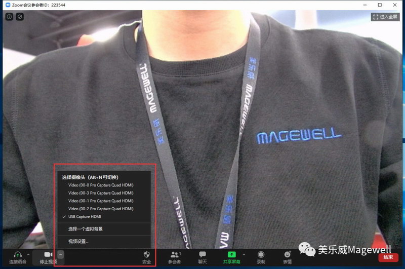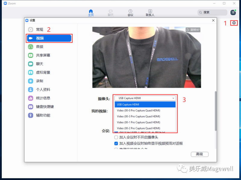 3、登录Zoom会议软件,在“设置”-“视频”-“摄像头”下拉列表中可以看到美乐威USB Capture HDMI视频采集棒和Pro Capture Quad HDMI四路视频采集卡, Zoom会议软件会立刻识别采集设备并实现视频采集和显示。