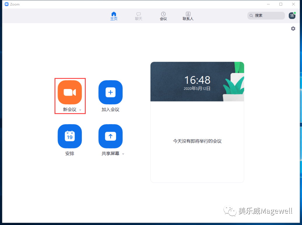 5、设置好视频和音频后,在Zoom软件首页面中点击“新会议”,进入会议室操作界面。