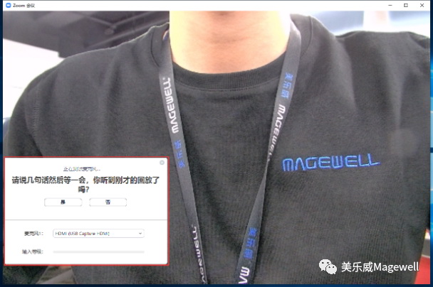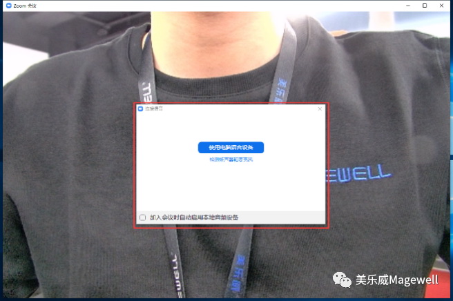 4、在“音频”页面中,可以根据会议环境和需求选择合适的扬声器和麦克风,在“麦克风”下拉列表中可以看到美乐威USB Capture HDMI视频采集棒和Pro Capture Quad HDMI四路视频采集卡, Zoom会议软件可以立刻识别采集设备并实现音频采集。