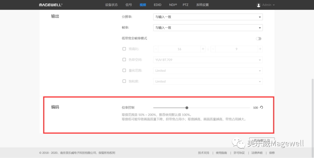 登录NDI编码器Web GUI界面,在“视频”-“编码”中,位率控制值可以选择从50%到200%之间(默认值为100%)。本次选择50%、100%和200%三个值进行测试,测试解码显示出来的图片效果。