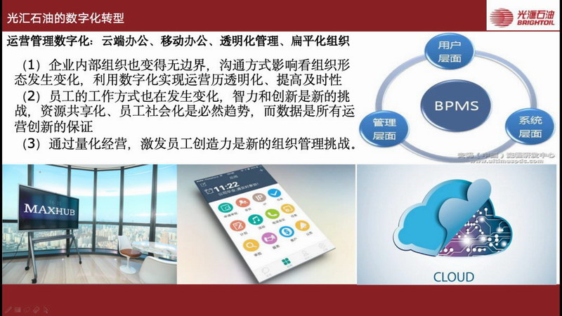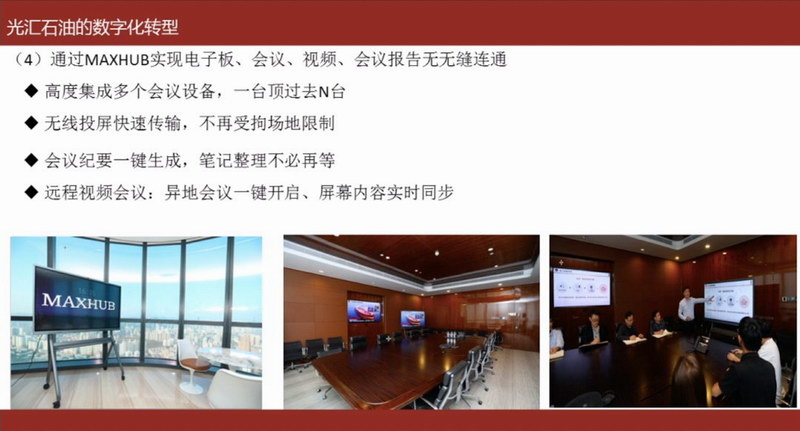 他指出近年来光汇石油不仅通过手机端的APP推进了客户体验数字化,还利用移动办公、云端办公以及MAXHUB 会议平板等创新工具、方式全面实现运营管理数字化。