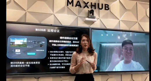 辜佳蓉分享了MAXHUB的产品优势:MAXHUB可以结合客户原有视频会议硬终端实现单屏双流、双屏双流等应用场景,客户的电脑内容可以无线投屏至会议平板、平板操作共享桌面;异地开会也能在屏幕同步观看文件,结合触摸功能,可与远端进行互动,避免了传统开会只能看不能摸的尴尬。