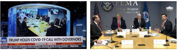 特朗普和副总统彭斯在联邦应急管理局( FEMA )与各州长举行视频电话会议。