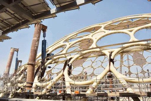 Al Wasl穹顶的总重量为550吨,为了将22.5米高的皇冠固定在距地面45米高的垂直格栅上,需要进行千斤顶作业。误差仅为3mm, 18个液压千斤顶在连接18根独立临时柱的钢索的辅助下,缓慢地抬起了弯曲的钢冠。