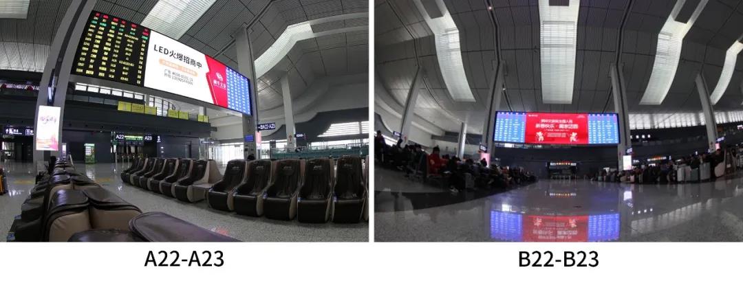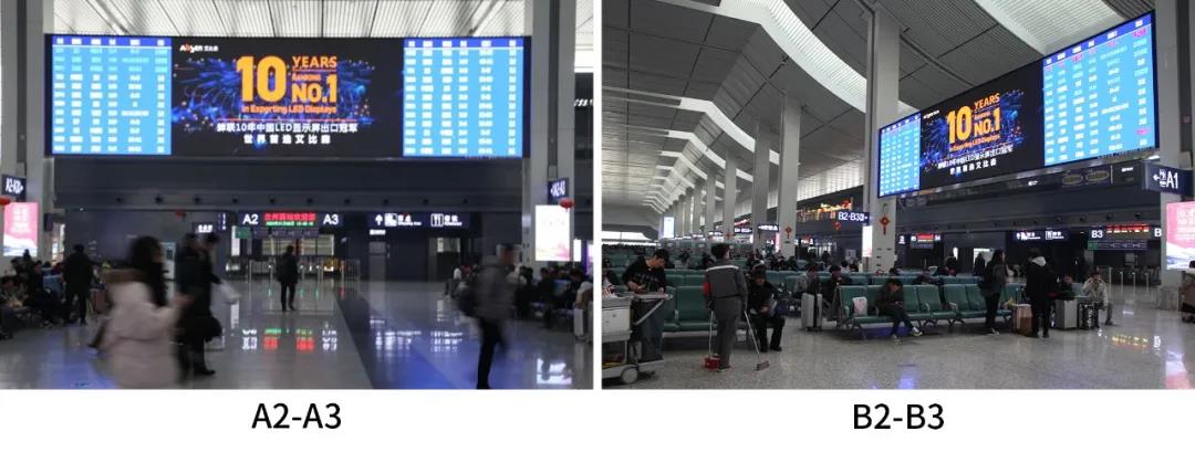 屏体主要安装在车站候车大厅南、北两侧和东、西两侧,A2-A3、B2-B3、A22-A23、B22-B23四个进站口的立柱间上方,使用多达1200个KL2.5箱体,总面积达369㎡。