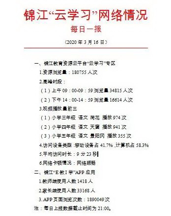 据悉,锦江e教i学APP在非强制家长和学生应用的前提下,成都市锦江区大部分学校的家校联系均在自主使用。疫情期间,锦江e教i学APP用于教师发布学习任务和师生在线互动答疑。周一到周五,家长端每天使用人数3.7万人以上,教师端每天使用人数1700人以上。“锦江i学”APP日总浏览量210万人次以上,日最高浏览数达360万人次。战“疫”期间,“锦江e教i学”APP发挥了不可替代的家校沟通桥梁和纽带作用,获得了家长的高度认可。