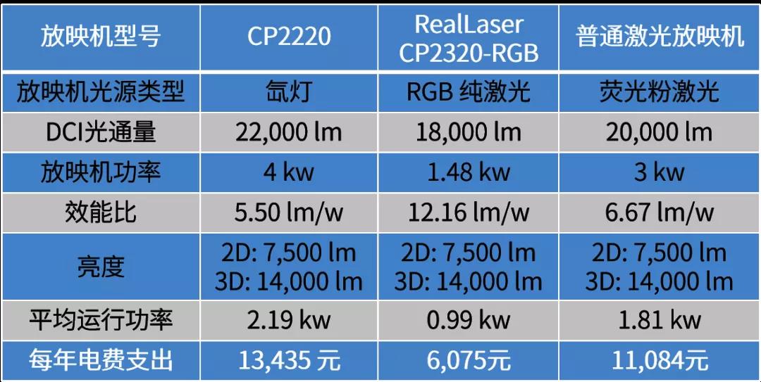 计算参数备注:2.4增益银幕;3D光效26%;2D目标亮度 14 fL,3D目标亮度 7 fL;每天 3D 影片排片率 70%;每天放映时长12小时;电费 1.4元/小时。