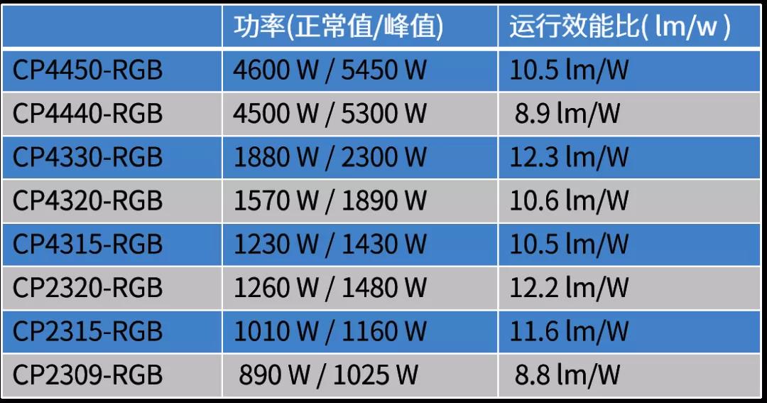 CP4440-RGB, CP4450-RGB由于使用了外置液冷箱以保证更高的冷却和散热,导致整体功率提高。而市场上主流应用的机型 CP2320-RGB 和 CP4330-RGB 的效能比都超过了 12 lm/w,可以说是性价比超高的选择。