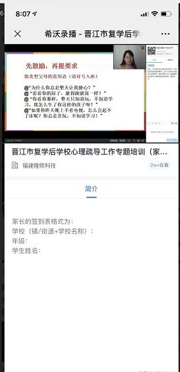 为帮助复学后学校尽快恢复正常教育秩序,令全校师生恢复良好的身心状态,并从不同层面探讨复学后学校心理疏导工作开展的思路和重点,2020年6月5日-6月9日,晋江市教育局、晋江市教师进修学校根据不同对象开展了“晋江市复学后学校心理疏导工作系列专题培训”。福建隆熙科技有限公司、希沃全力参与协办,培训直播全程通过“希沃录播云资源管理平台”顺利开展。