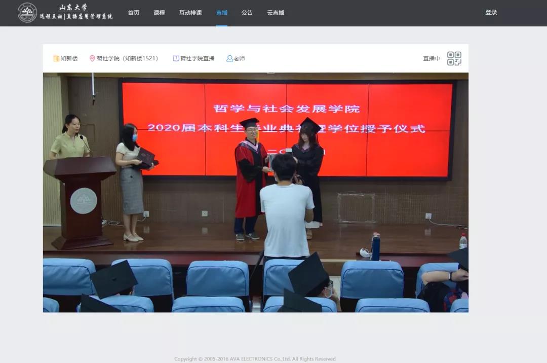 山东大学2020年本科生毕业典礼暨学位授予仪式,全程采用一校三地连线直播的形式举行。全体毕业生分别在主会场、分会场或通过奥威亚云直播平台,共赴毕业盛典。