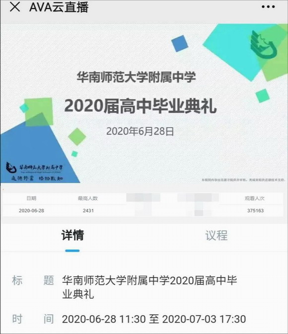 对于无法亲临典礼现场的家长们,华南师大附中提供了直播和点播回看两种方式供其选择。此次直播毕业典礼,在线观看超37万人次。