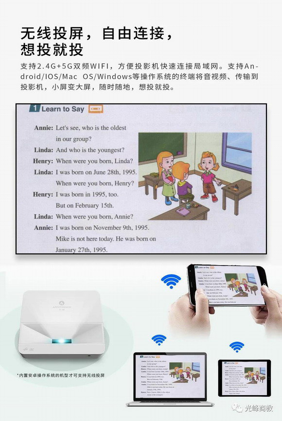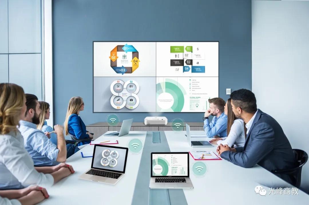 光峰激光投影机内置安卓操作系统,可通过WiFi链接手机、平板、电脑等终端设备,搭配5G,快速实现小屏与大屏间的超快传输。光峰商教助推中小学、高校建设智慧教室,结合5G网络低延时、广连接、大宽带的特点,将有效推动远程教育的发展。将一线城市优秀师资教育通过投影系统实现优质教育资源的共建共享,促进教育信息化取得长足发展。