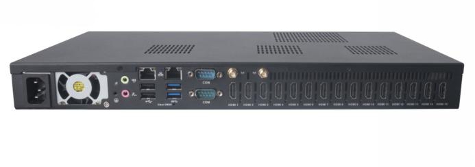 拿到杰和G1568整机,重量上让人有些意外,拙朴的全金属机壳没有比家用主机轻很多,对于复杂的安放环境,外壳拥有良好的承重能力;可以看到所有的折弯和卷边,都进行了倒角,不会有刮手和锋利的感觉;在按钮和接口的外观上,杰和G1568延续了杰和科技数字标牌产品一贯的高品质要求,孔位、丝印、按钮的质量要求都非常考究,力求精确和平整;背部的15个HDMI输出接口标准统一,表面镀层十分亮眼,隐约嗅到一股“黑科技”的味道。