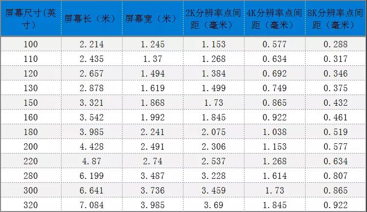 Micro LED显示技术像素点间距的大小,决定了技术难度。LED显示技术的成本与像素数量成正比,像素数量的多少,决定了Micro LED显示产品成本的高低,下表是100吋以上超大尺寸Micro LED 2K、4K、8K超高清显示的屏幕尺寸,以及像素点间距的需求。