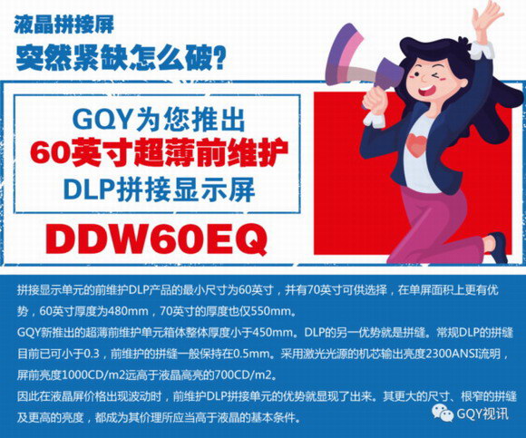 GQY视讯通过线上淘宝官方旗舰店及线下各分公司及办事处推出60英寸前维护DLP单元并有整套的2x2系统、2x3系统及2x4系统供大家选择(MiniLED屏相关信息请联系线下各分公司及办事处),欢迎访问GQY视讯淘宝官方旗舰店并联系线下各地区办事处及分公司获取拼接显示屏产品的最新信息。