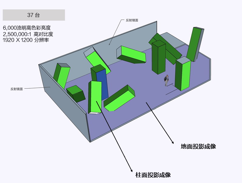 其中,在地幕投影中,增加反射镜可以增加景深感,让观众有更强烈的沉浸感;在柱面投影中,投影机采用竖投及ELPLX01超短焦镜头,即使观众的观看距离很近,投影机光路也不被遮挡。另外,地面投影和柱面投影都添加了互动装置,可以捕捉到人的动作,随之做粒子变化。以科技赋能艺术,打造无边界视界体验。