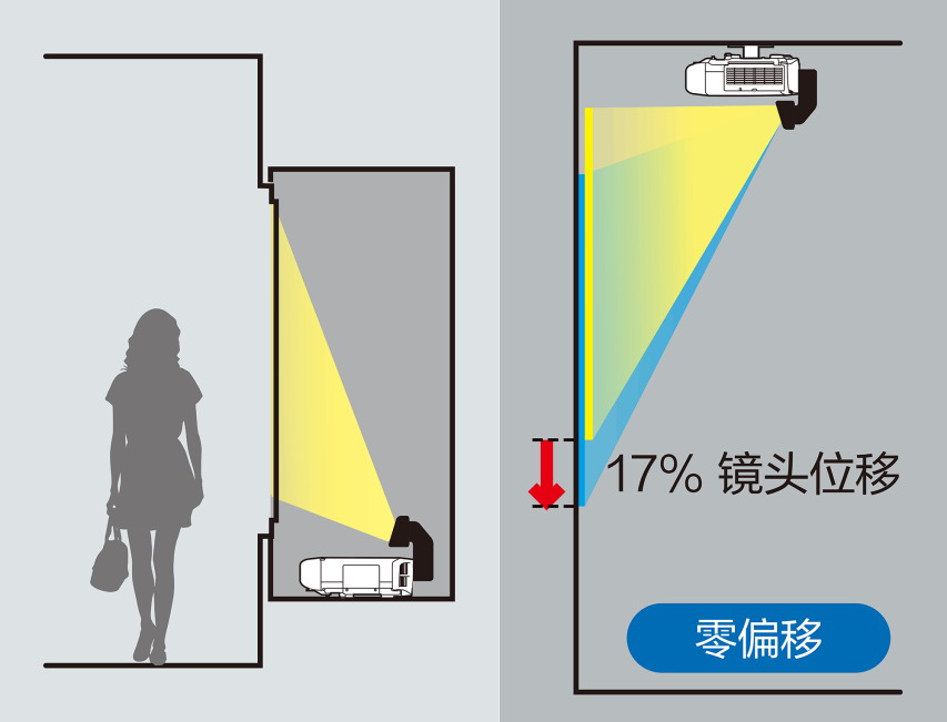 爱普生投影机采用零偏移超短焦投射镜头,该镜头可以为用户有效的节约安装空间,最短可实现0.35镜头投射比[2],基于镜头零偏移量和前置散热设计,只需约76 厘米,即可投射100 英寸(16:10)的图像,同时具备垂直±17%、水平±10% 的镜头位移功能,即使在狭小空间依然可以呈现超大画面,呈现出色的视觉效果。