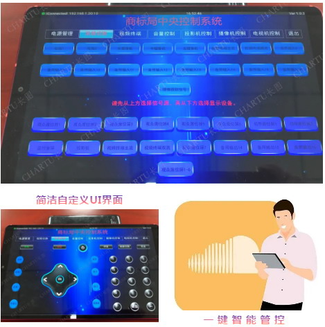 在多功能会议室建设中,长图选择增加一台视频终端,解决中国商标局远程视频会议的需求,无论在疫情期间保障安全还是在日常工作中提高工作效率都能高效满足;增加2台摄像机,并通过设定预位置来实现摄像追踪目的;增加了1台音频处理器,实现对音频的随意控制;增加6台液晶电视,满足台下观众席视频观看;增加一台长图品牌1616的视频矩阵,实现视频信息的随意切换;增加长图品牌的中控CT-3,通过串口控制、红外口控制、弱继电器控制实现对会议室所有设备的控制,并可通过平板电脑一键智能管控。