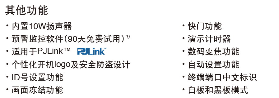 除此之外,松下商教投影机UX系列包含丰富的端口设计、个性化开机画面、黑板/白板模式、断电保护功能、防盗设计、内置10W扬声器等多种功能,此外还有多种免费软件可供使用。