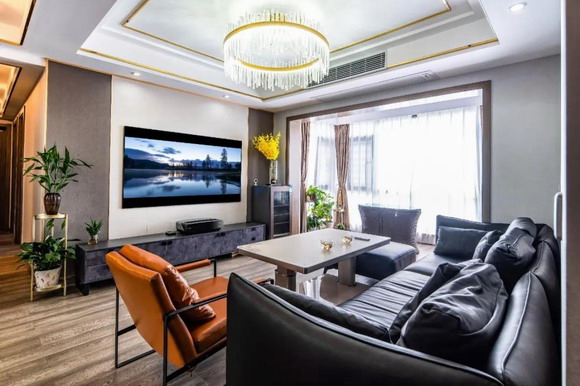 你很难从刘先生的家庭装潢,看出他的职业其实是非常有技术含量非常硬核的工程师。木色地板、黑色沙发、深色电视柜......唯一比较抢眼的就是客厅里超大屏幕的海信激光电视88L5,虽然颜色同样稳重内敛,却有《2001太空漫游》里那块史前黑石碑般的科技感,隐而不发。