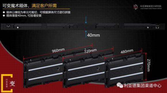 VEM系列产品箱体以模组为单元可裁切,可根据屏体尺寸进行拼接。箱体厚度40mm, 可挂墙安装,满足不同客户的需求。1*2箱体排列,完美的16:9拼接。箱体斜角设计,满足立体拼接需求 ,同时可定制60°,90°拼接,并且立体拼缝≤3mm。