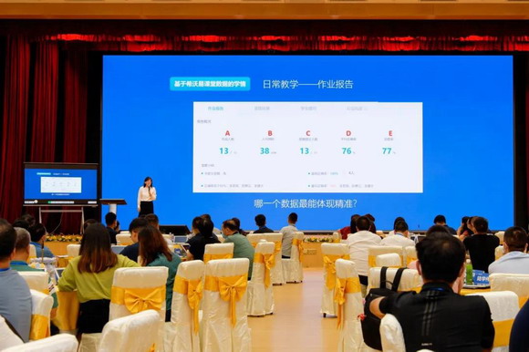 希沃学务事业部教研顾问邱悦做了以“基于智慧课堂的精准教学”为主题的分享。她以“精准应体现在何处?”的问题开场,并发起了打开平板体验并寻找“精学”内容的趣味游戏,引起了在场与会嘉宾的讨论与热情参与。接着她从不同的角度为与会嘉宾分享了易课堂在促进精准教学与智慧课堂建设中的具体路径与方式。