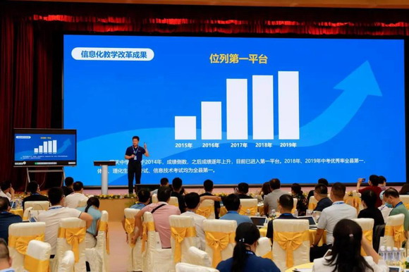 中国民办教育协会常务理事、蓝天教育集团董事长赵恒龙分享了他自2016年以来的信息化教学改革探索之路。蓝天中学从建校初期的200名学生,增长到现在的2000多名学生,从成绩倒数到目前的“第一平台”,2018年、2019年的中考优秀率全县第一,体考、数理化实验考试、信息技术考试全县第一。他认为民办教育要主动求变,从规模发展转向内涵发展,加大教学改革力度,推进智慧课堂建设,引领教育发展潮流。