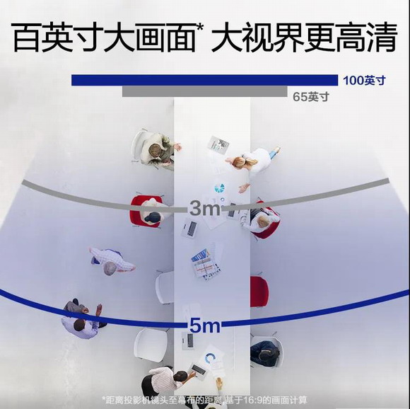 对于大中型会议来说,让处于不同位置的与会者都能清晰看到投影内容非常重要。相较于65英寸的小屏幕,超百英寸画面可以让更多与会者看清屏幕内容,而且不存在反光问题,无论哪个角落都能将投影内容一览无余,充分满足中大型会议室的显示需求。