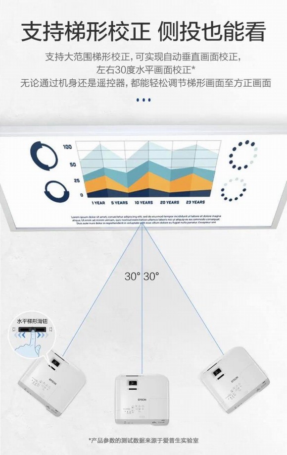 投影画面的调试通常需要耗费比较多的时间,特别是投影机无法垂直正面摆放时,更是令人头大。全新的爱普生商用投影机均支持梯形校正,即使不正对投影幕布或墙壁,从侧面也可轻松投出方正画面。配备的水平梯形校正滑钮,一“指”完成画面调节。让投影不受空间限制,实现更灵活的摆放。