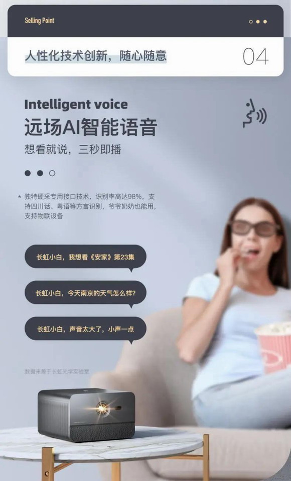 现在,长虹激光几乎全线产品都配备了自主研发的智能语音系统,无需遥控器,只要说出“长虹小白”就能快速调取,把用户完成节目查找、语音加减、进度调节、资讯查询等等功能,做到“只动口不动手”。
