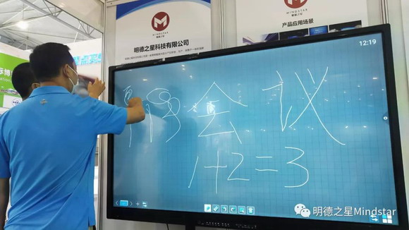 同时,公司携带的另一款触摸一体机,在会展当天也迎了不少的客户来了解、体验,触摸一体机作为现目前学校用得最多的教学设备之一,该设备将红外触控技术,智能化办公教学软件、多媒体网络通信技术、高清平板显示技术等多项技术综合于一体,在实用性、先进性、扩展性、手写方便性上,收到了广大客户的认可,同时内置的教学软件,具有记录、导出等功能,供学生课后复习等。