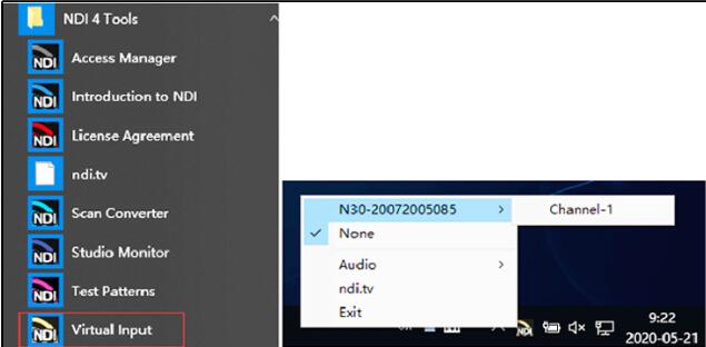 2、在电脑端安装NDI Tools工具,然后打开NDI Tools工具文件夹中的NDI Virtual Input程序,它将显示在你的电脑右下角工具栏中,右击选择需要接收的NDI设备和通道。