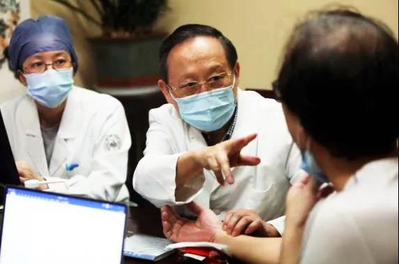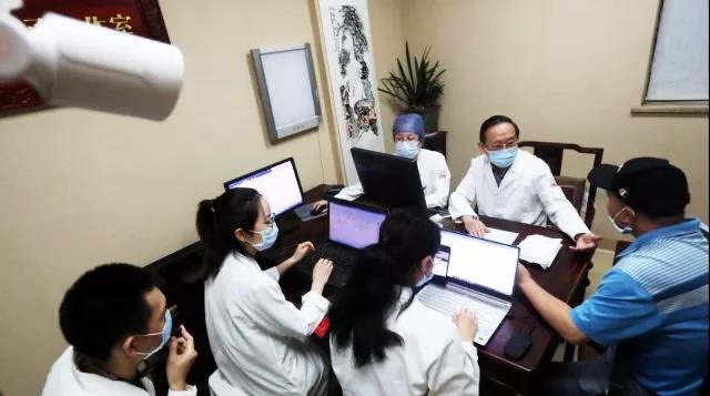 院内名中医工作诊室内,经验丰富的中医专家正对患者把脉问诊,周围助手各司其职,将临床诊断知识实时传送。