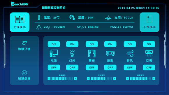在研讨型智慧教室里,学生们会发现灯光空调窗帘等设备都能一键开关,用最短时间,为即将开始的课堂准备最舒适的环境。