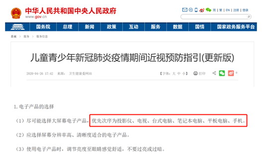 为预防近视,权威部门发布了《儿童青少年新冠肺炎疫情期间近视预防指引(更新版)》,指出在电子产品选择方面,要尽可能选择大屏幕电子产品,优先次序依次为投影机、电视、台式电脑、笔记本电脑、平板电脑、手机。