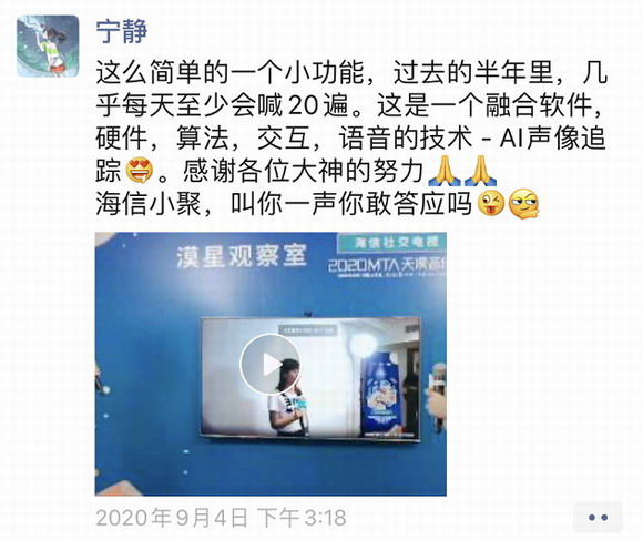 那一天,海信社交电视产品经理宁静发了一条朋友圈。这个90后的姑娘说,“这么简单的一个小功能,过去的半年里,几乎每天至少会喊20遍。这是一个融合硬件、软件、算法、语音的技术 - AI声像追踪。”