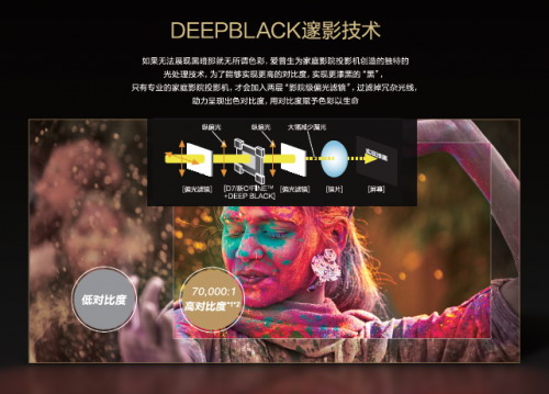 高亮度会给遮光条件不好的环境带来更好的画质,但是过高的亮度,有可能会导致对比度的下降,比如让黑色沉不下去,严重的会变为灰色,从而降低家庭影院的效果。明和暗的对比,直接决定了画面带来的冲击力,对比度越大意味着能够呈现的黑白过渡细节越多,色彩层次亦会更加细腻。爱普生CH-TW5800投影机,通过爱普生独有的专门为家庭影院创造的DeepBlack技术,对比度高达70000:1*3*4,让亮的地方更亮让暗的地方更暗。无论原电影画面色彩是深抑或是浅,都能完整展现出画面的景深与细节。无论是白天使用还是晚上使用,都能带来清晰、明亮的影像,轻松观影,还等什么。