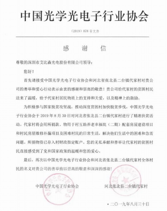 顺应国家政策,积极响应号召,2019年艾比森与中国光学光电行业协会一起,参与到了帮助代家村的扶贫行动中。为积极参与国家脱贫攻坚战,推动深度贫困村加快脱贫步伐贡献力量。