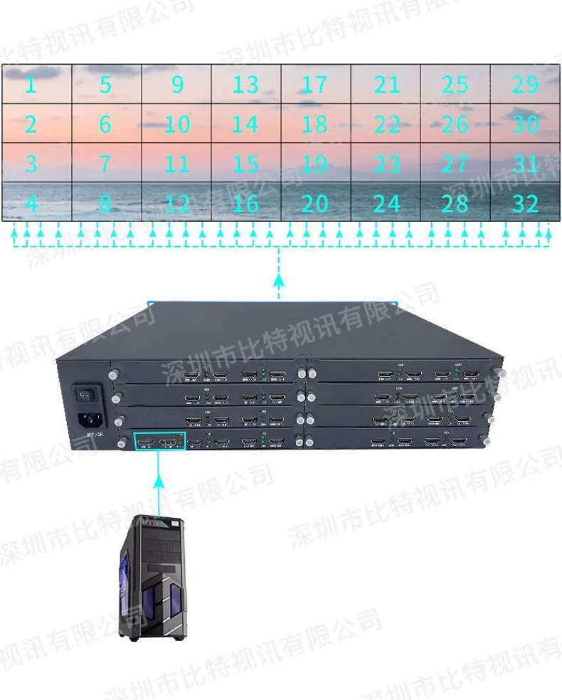 2.最大支持1进32出,可任意组合多种拼接模式:横屏/竖屏/横屏异形拼接,且支持大规模并联使用。