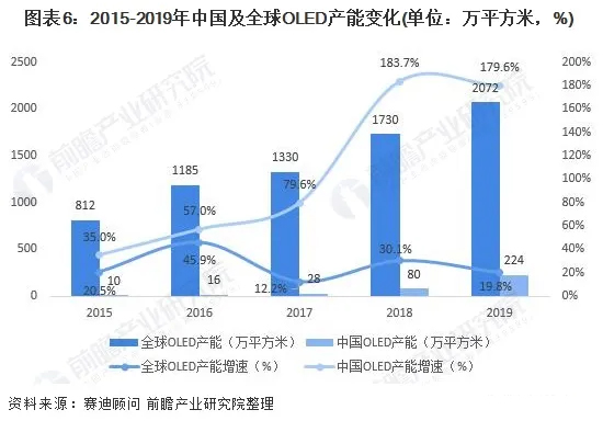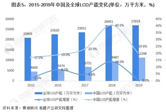 并且,随着多条LCD G8.5/G8.6以及G10.5代线、OLED G6代产线产能加速释放,我国LCD和OLED产能均保持高位增长,增速遥遥领先于全球面板产能增速,2018年我国LCD面板产能增速甚至达到了40.5%。2019年,我国LCD和OLED产能分别达到了11348万平方米和224万平方米,分别同比增长19.6%和19.8%。