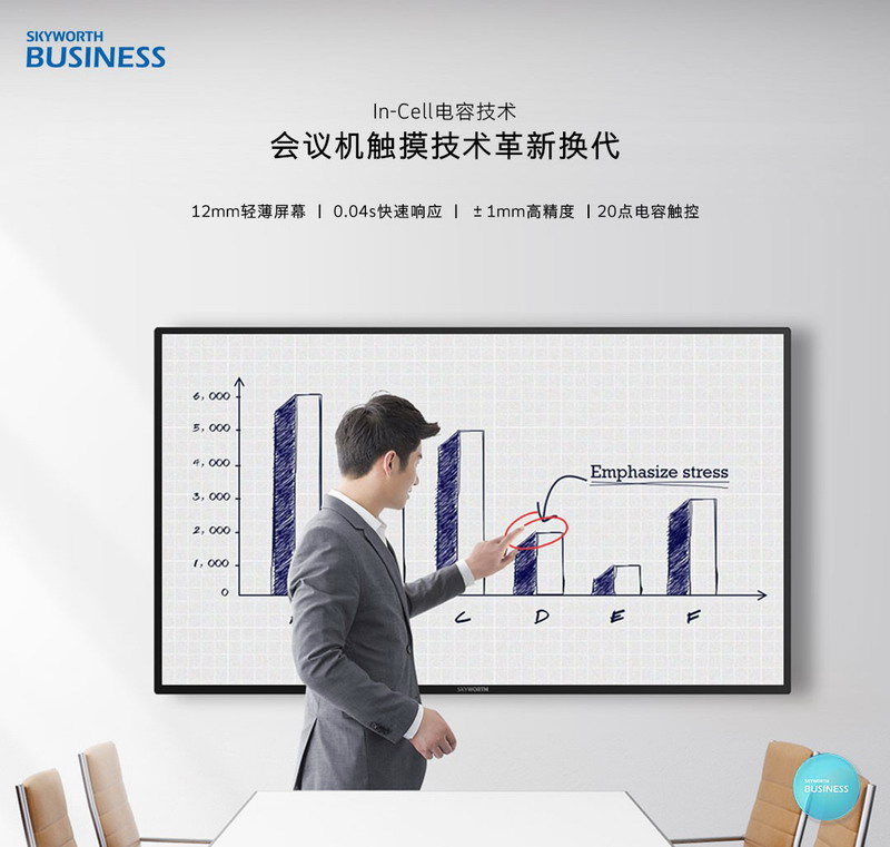 创维商用从市场需求出发,凭借自己在显示领域不断探索的经验,突破层层技术阻碍,成为国内首家将In-Cell电容技术应用于会议大屏的厂商,解决了技术应用的量产难题。实现±1mm高精度的触摸书写和0.04s低延迟的屏幕反应,达到20点原笔迹超流畅的书写体验,让高端商务办公更高效。