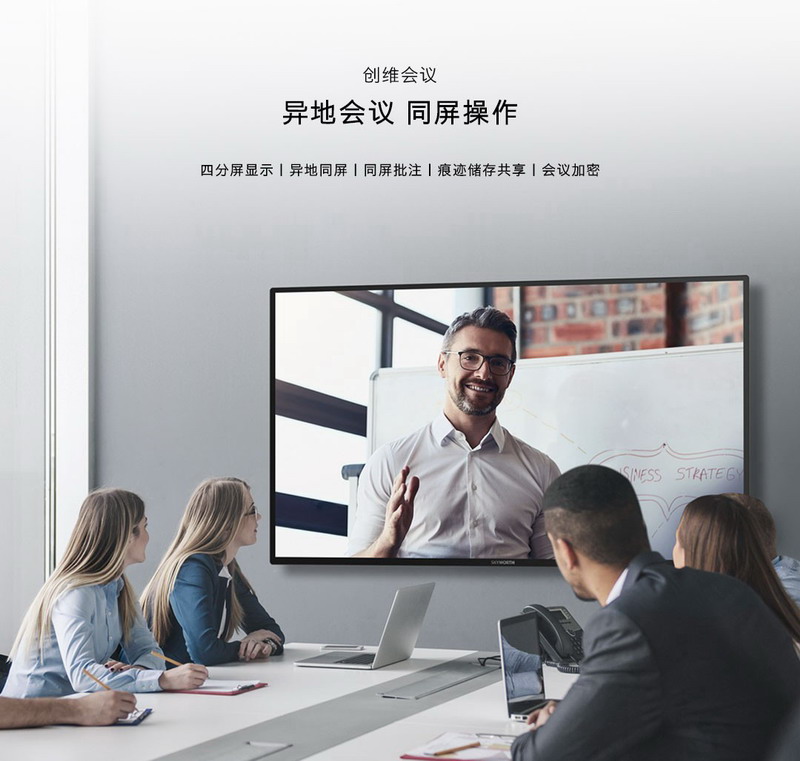在操作系统上,搭载创维自研的智能会议系统,支持异地会议,同屏操作。内置的本地会议白板功能,将手势操作与精准触控相结合,可实现无界面板书写,调整页面大小、旋转页面,选择笔触及擦除、截图等操作,让会议尽在掌控。无线投屏及欢迎屏功能也大大减少会议前期准备的繁琐程序,让商务办公更加方便。