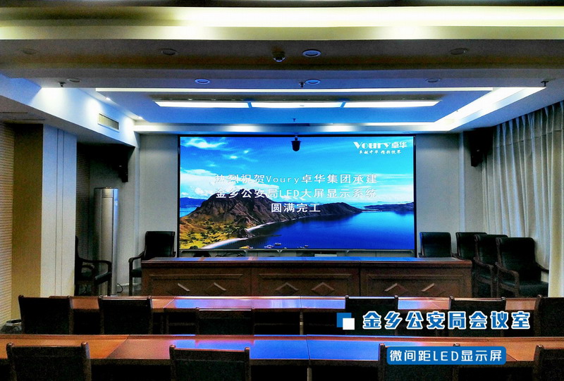 金乡公安局会议室采用Voury卓华P1.2微间距LED显示屏拼接而成,Voury卓华微间距大屏幕系统将本地会场图像和远程会场画面进行清晰的画面还原,并结合大屏幕拼接图像处理融合技术,使会议双方与会者感觉如在同一会议室,实现了高临场感的远程会议体验,满足政企日常会议,实现及时沟通、高效运作。