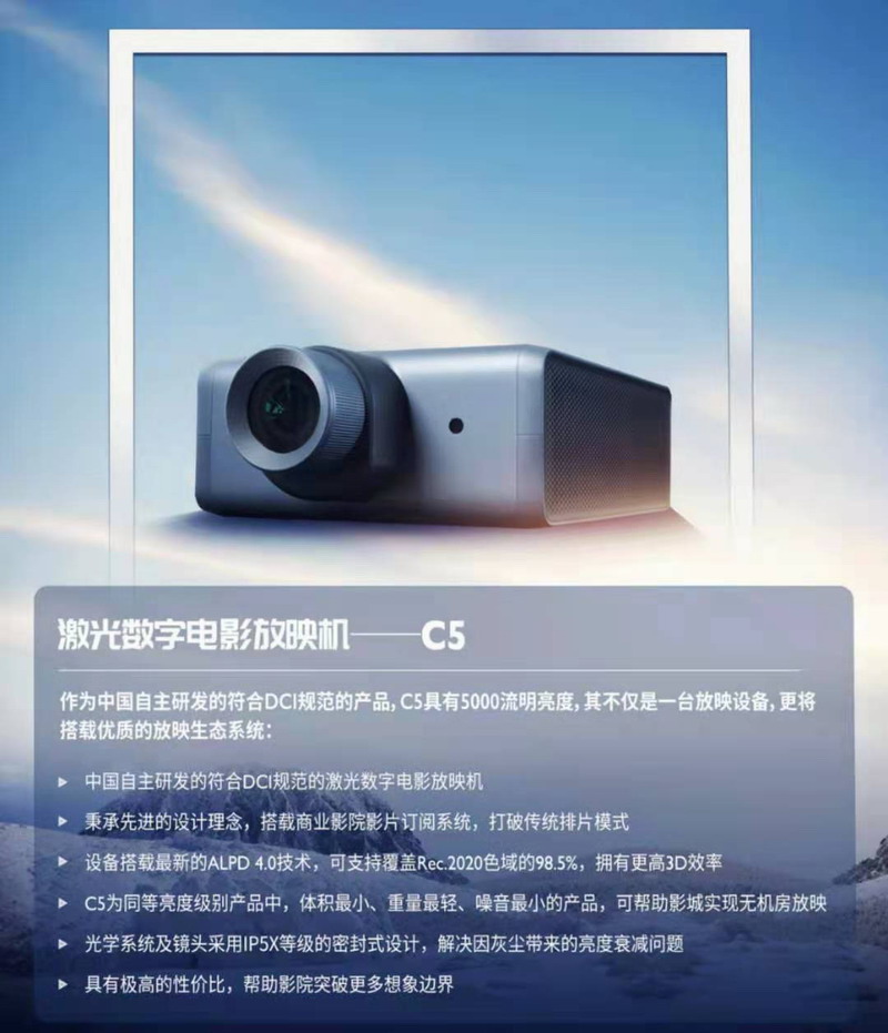 作为全球最小体积的DCI认证激光荧光数字电影放映机,C5在保证亮度以及成像质量的同时,进一步降低了光源成本,满足中小型影厅的放映需求,代表了光峰科技在研发电影设备技术方面取得的一大成就,使其成为中国唯一一家具有开发、制造符合DCI标准数字电影放映机能力的公司。《人民日报》报道称其“实现了中国数字电影放映关键设备零的突破”。
