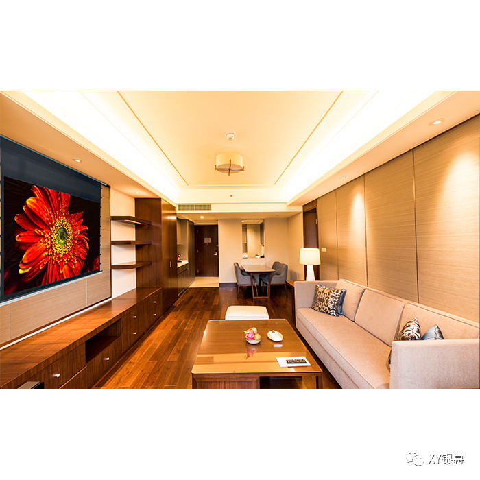 如果家里客餐厅一体,可以取消电视墙。在面积较小的横厅中,如果把沙发或电视柜摆在中间的话,整个客厅与餐厅的活动空间都会显得很拥挤,这样的情况下,可以把沙发和餐厅分别摆在两端靠墙,加入XY豪华隐藏天花幕,看电影时可以放下,平时不看的时候就收起,即可保持空间的宽敞,又能保持房子装修风格。