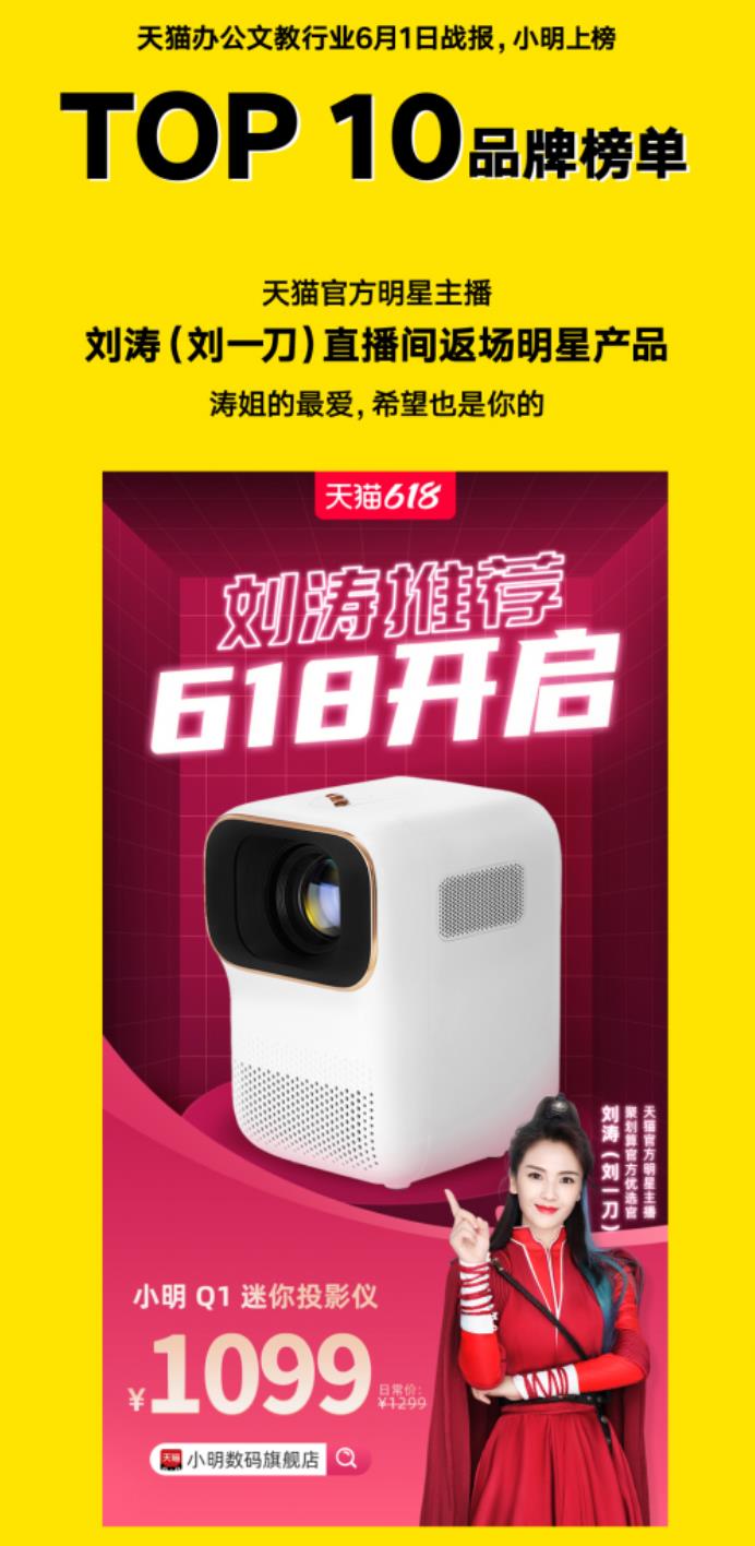此外,小明 Q1 迷你投影仪还登陆天猫官方明星主播、聚划算官方优选官刘涛“刘一刀”直播间,以出色性能和惊喜好价,成为直播间返场明星产品,并入选天猫办公文教行业品牌TOP 10。小明 Q1 迷你投影仪的完美首秀,尽显千元投影机皇的风采。